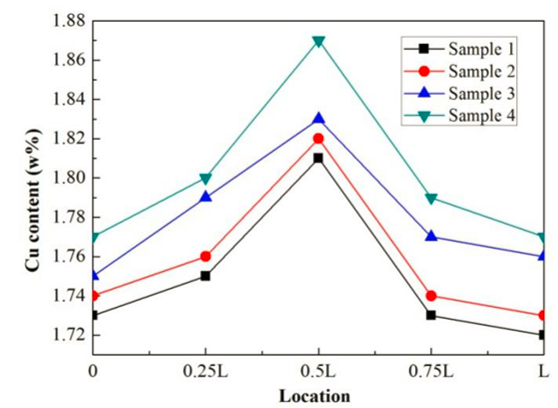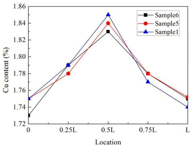 Figure 7 shows the copper content from the surface to the core of the samples with different wall thicknesses. It can be seen that from the surface of the sample to the core, the copper content is increasing, from 1.73% to 1.75 on the surface to 1.83% to 1.85% in the core. The heart of sample 1, sample 5 and sample 6 The copper content is 1.85%, 1.84% and 1.83% respectively. It can be seen from formula (9) that the solute content in the molten metal is high. Under the action of the squeezing force, the Cu-rich molten metal is forcibly squeezed into the core of the sample, resulting in a higher Cu content in the core than on both sides.