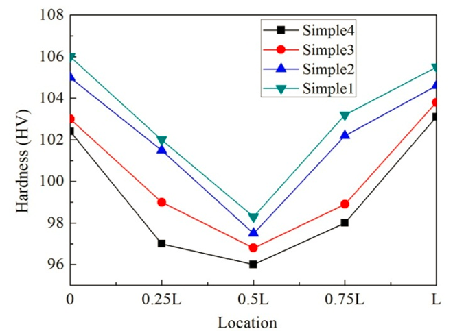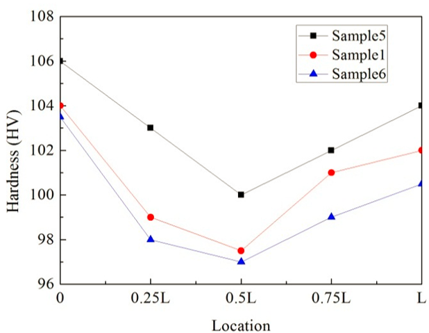 It can be seen from Figure 5 that the hardness value of sample 1 to sample 4 increases as the distance to the inner runner increases. As the distance to the inner runner increases, the squeezing force decreases, and the degree of supercooling of the molten metal is also reduced, resulting in a decrease in the cooling rate of the molten metal, and an increase in shrinkage defects formed in the center of the solidification process of the molten metal. Therefore, the core hardness of the alloy is reduced.