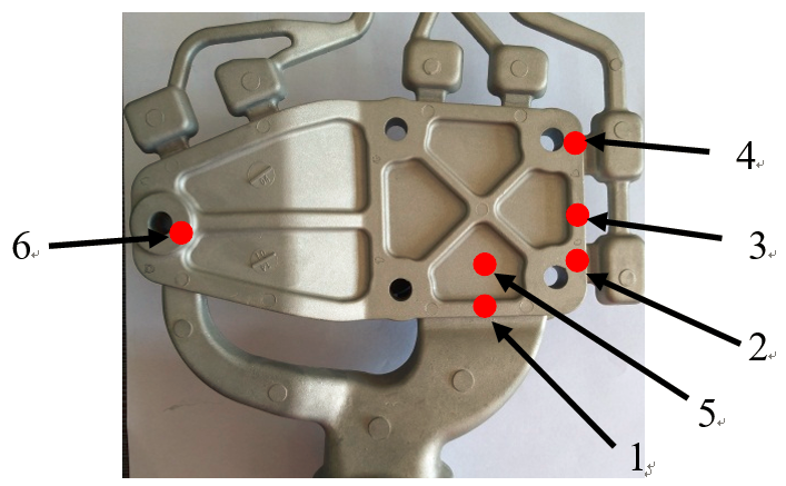 Select ADC12 aluminum alloy, melt ADC12 in KGPS160/500 intermediate frequency induction furnace, melting temperature is 750±20 ℃, pouring at 680±20 ℃, using SCH-350 squeeze casting machine for squeeze casting, using M5000 straight The chemical composition measured by the spectrometer is shown in Table 1. The obtained squeeze casting parts are shown in Figure 1. Select site 1, site 2, site 3, and site 4 as the research objects of the tissue and solute content of different sites. The distance from the inner gate is shown in Table 2. The part 2 with a wall thickness of 17 mm, the part 5 with a wall thickness of 6 mm, and the part 6 with a wall thickness of 27.5 mm were selected as the research objects of the influence of the wall thickness on the tissue and solute distribution.