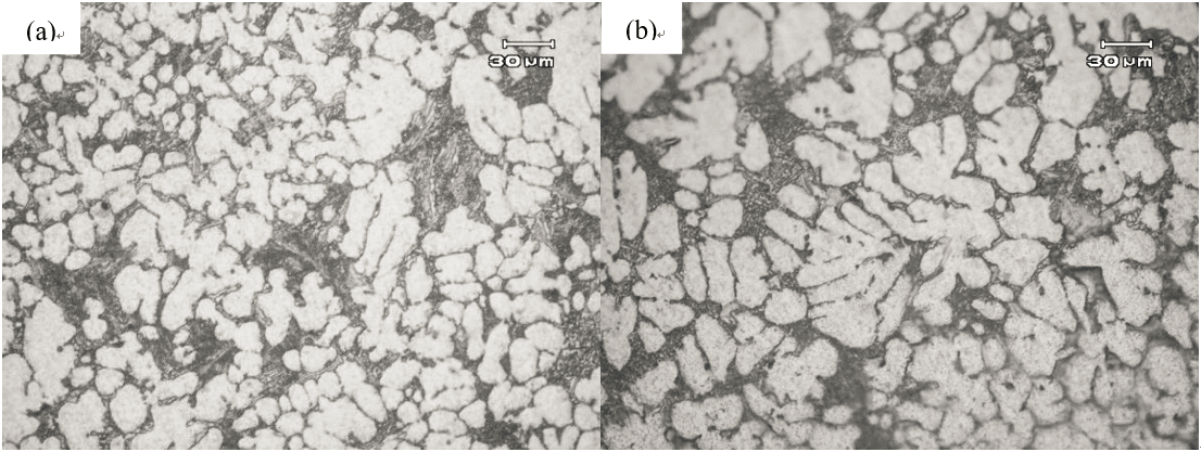 Figure 6 shows the heart microstructure of samples with different wall thicknesses. It can be seen that the grains of sample 5 are the smallest, and the grains of thick-walled sample 6 are relatively coarse. According to calculations, as the wall thickness increases, the grain sizes are 18.25 μm, 27.38 μm, and 45.22 μm, respectively. The distance between sample 2, sample 5 and sample 6 from the runner is 201 mm, so during the filling process, the pressing force to reach these 3 positions is the same, and the wall thickness is 27.5 mm in turn (sample 6) , 17 mm (sample 2), 6 mm (sample 5), the thin-walled sample contains less molten metal, and the cooling rate is fast during the solidification process, which leads to an increase in the degree of subcooling, according to formula (3) and According to the analysis of formula (4), increasing the degree of subcooling can reduce the critical nucleus radius and critical nucleation work, thereby causing an increase in the number of crystalline cores. The greater the number of crystalline cores, the finer the crystal grains, so the crystal of sample 5 The particles are the smallest.