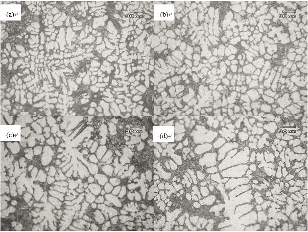 Figure 3 shows the microstructure of the core of the sample at different locations. It can be seen that the structure is composed of white α-Al phase and black eutectic Si phase. As the distance to the inner gate increases, the grains of the sample become coarser. After the molten metal fills the cavity, it solidifies under pressure, and the first contact part with the mold solidifies first, but the pressure still acts on the casting. Unlike the direct squeeze casting process, only a small amount of plastic deformation occurs on the surface of the casting at this time. Because the pre-solidified structure hinders the transmission of pressure and causes the loss of extrusion force, that is, the extrusion force on each part of the part is different, and as the distance to the inner runner increases, the extrusion force gradually decreases. It can be seen from Figure 1 that sample 1 is closest to the gate, so the extrusion force acting on sample 1 is the largest, followed by sample 2, sample 3, and sample 4. The distribution law of its grain size is also Sample 1 is the smallest, followed by sample 2, sample 3, and sample 4 in descending order. The grain size has increased from 18.35 μm for sample 1 to 39.85 μm for sample 4.